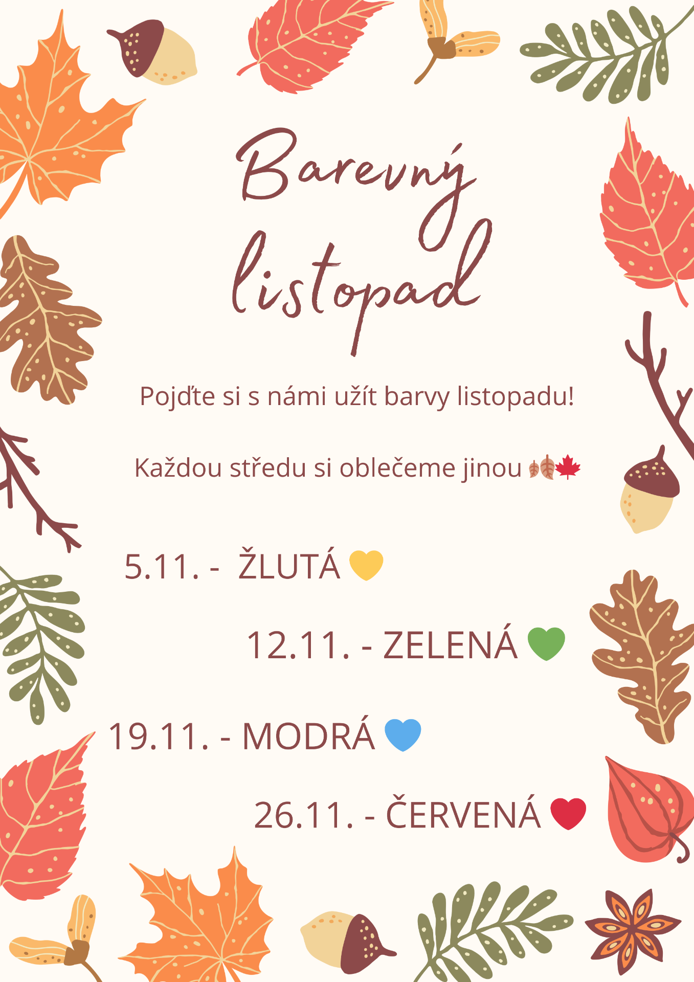 Celý listopad proto věnujeme barvám a každý týden bude mít svou vlastní. Děti se seznámí s danou barvou prostřednictvím her, tvoření, pohybových aktivit i drobných pokusů.
