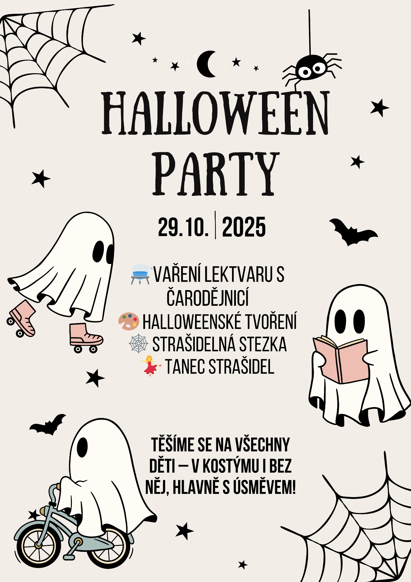 Ve středu 29. října 2025 nás čeká Halloween Party – den plný čar, zábavy a smíchu. Na děti čeká vaření lektvaru s čarodějnicí, tvoření, strašidelná stezka i tanec malých strašidel.